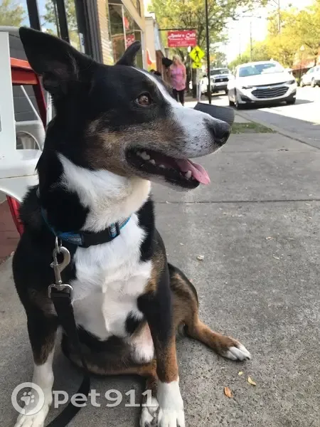 He is my 10yr old neutered border collie/Queensland healer mix. He is black with a white chest and underbelly. He has scar tissue in the tips of both his ears causing them to slightly flop over at the ends.