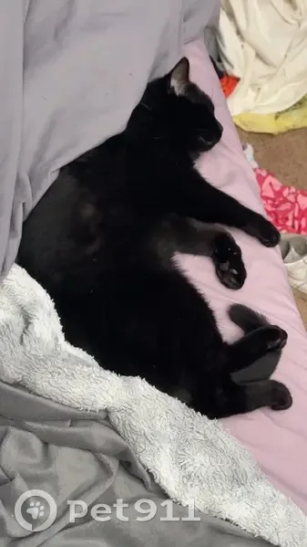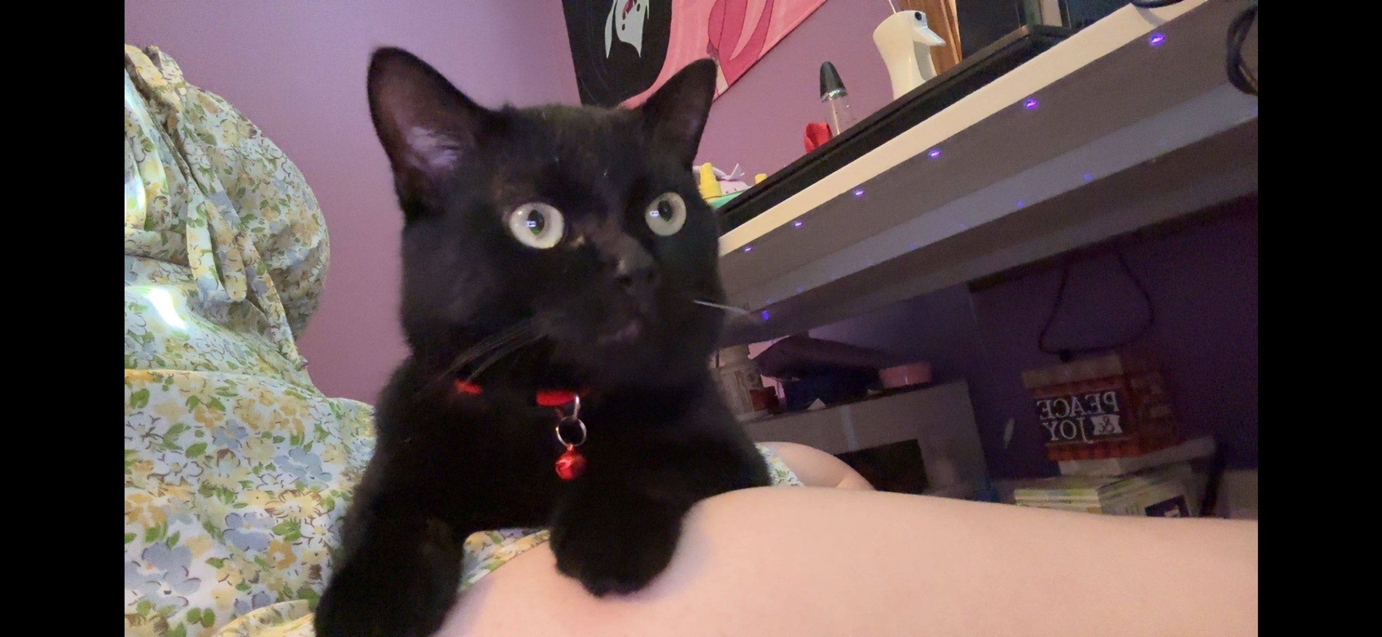 Male with black fur with scattered single white hairs on back. Last seen wearing a purple breakaway collar with a bell. Light green eyes. At least one year old. Very friendly.