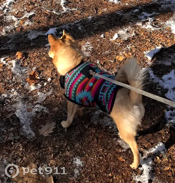 Tan color, small size, mixed breed, may look like a Chihuahua or a Shiba puppy, about 15 lb, wearing a geometrical patterned jacket, (may have fallen off). Gone missing on hikes.