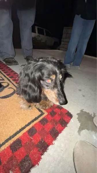 He is a long haired dachshund. Black and a little brown. Super nice and hyper. He ran out the back laundry room door when someone was trying to let the other dog out.