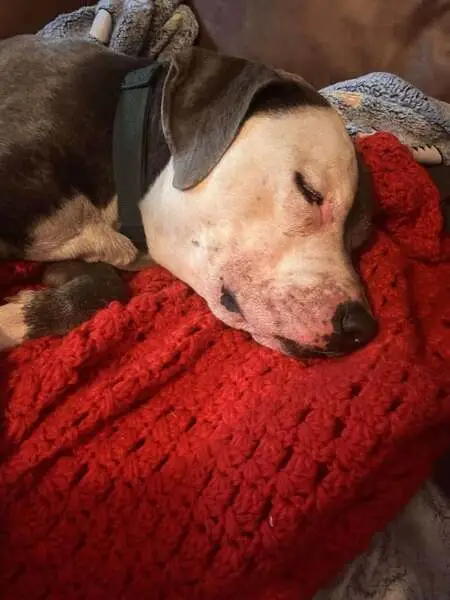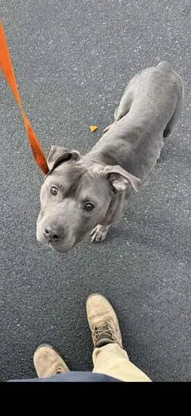 Grey pitbull with white markings on chest, nose, feet, and end of tail. Long ears and tail. Broke his collar and took off from the Baseball Field.