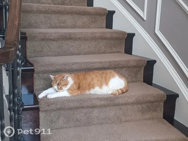 Orange tabby, white paws and belly, chubby (19 pounds) very friendly and cuddly. Ghosty is 5 years old. He is an indoor and outdoor cat. Always comes back for the night and always stays close to the house. On the 5th of November, he didn't come back... And he's been gone since then...