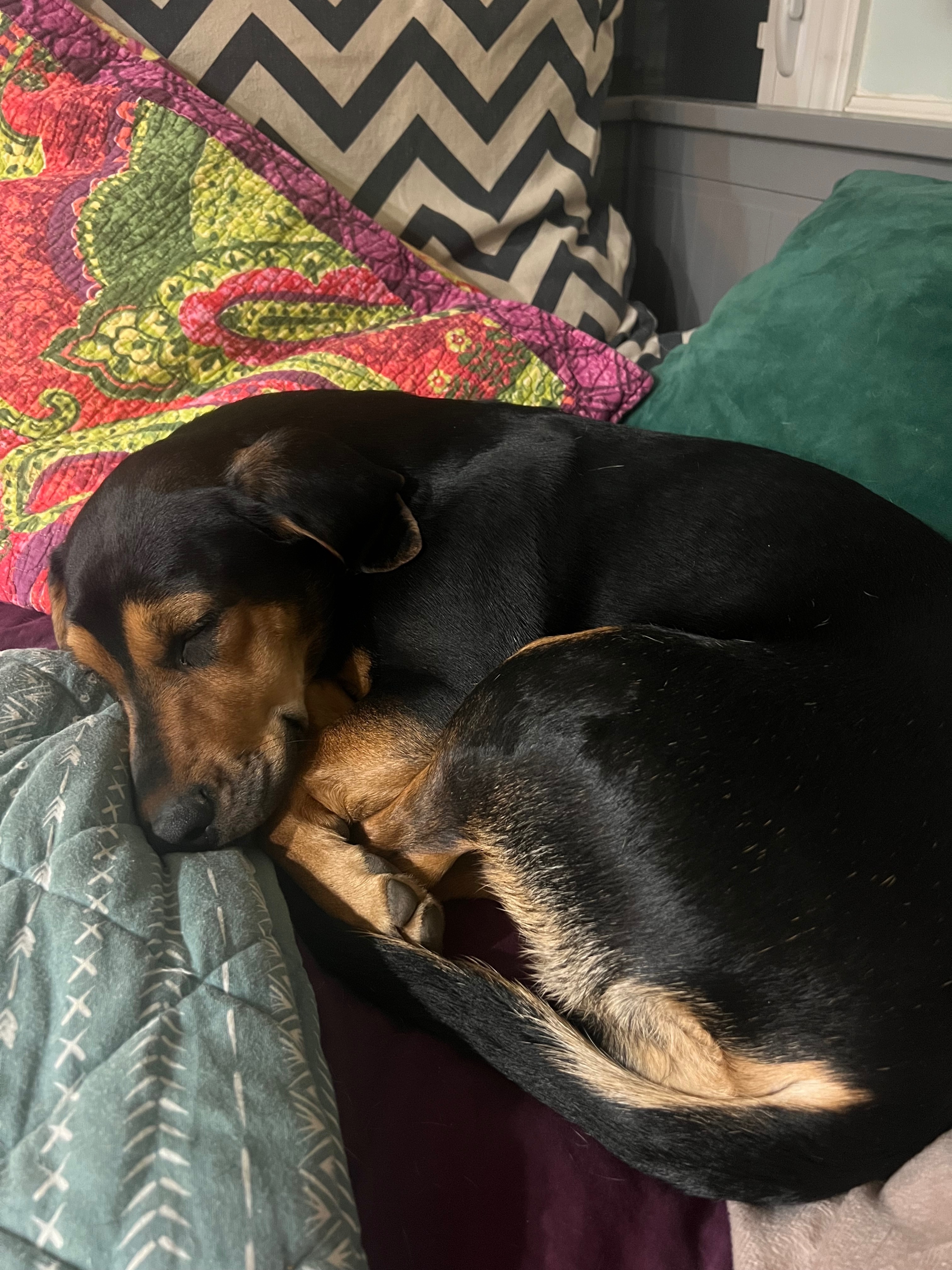 Etta is black and tan, she has a long body and short legs. She ran between my legs and out the front door. She was with her brother who was caught on Lost Oak Road and returned but she got away. She is friendly and sweet but probably scared. She and her brother Henry are bonded. He misses her terribly.