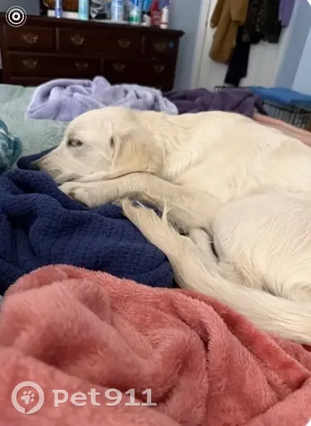 All white female golden retriever. Five months. Thirty five lbs. Backyard fence slat appears to have been kicked in. Dog taken from yard. Name Kelsea. Police notified.