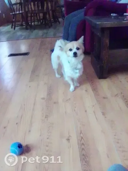 White and beige, brown eyes, friendly, playful ,loves to cuddle, he's wearing a camouflage collar and his rabies and information with his owner's name adress, phone number on the tags. He's very much loved, spoiled and missed more than words can say