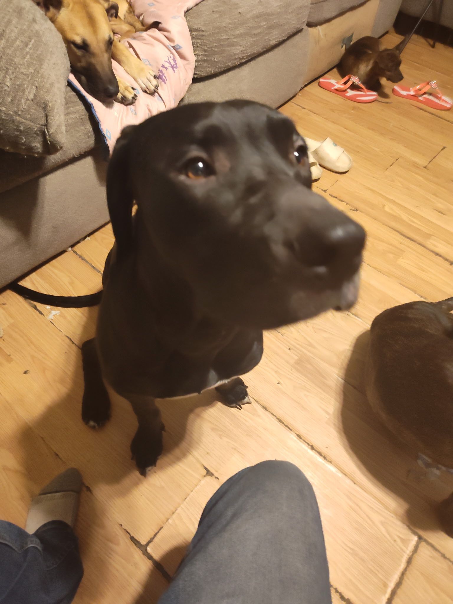 Leo is black dog with a white chest he will answer to Leo his very friendly and might seems scared of u at first if he don't know u but he will NOT bite or anything