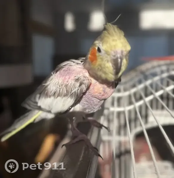 She has lots of feathers missing on her chest and upper wings. She’s small, delicate, sweet and will come to you.