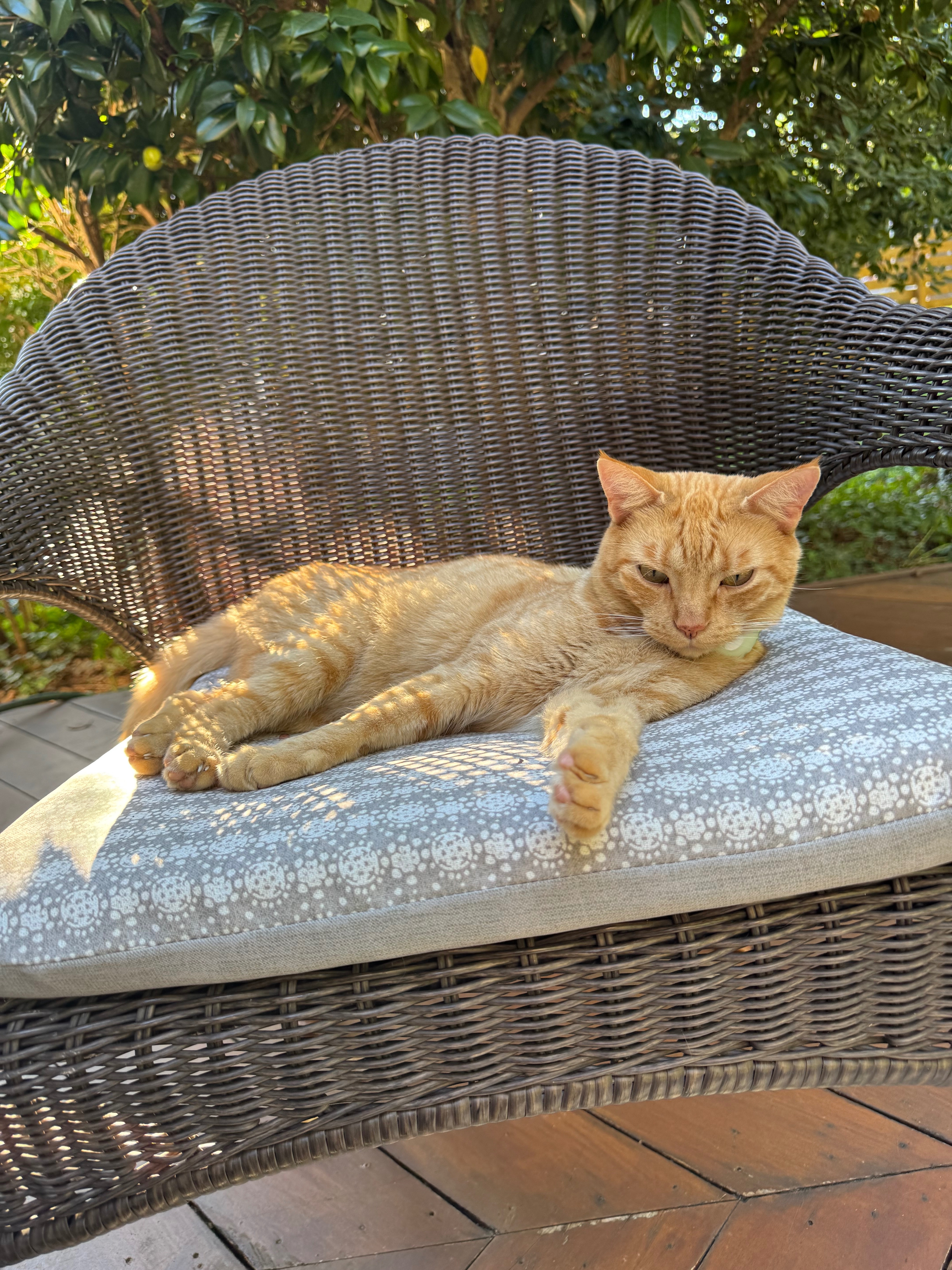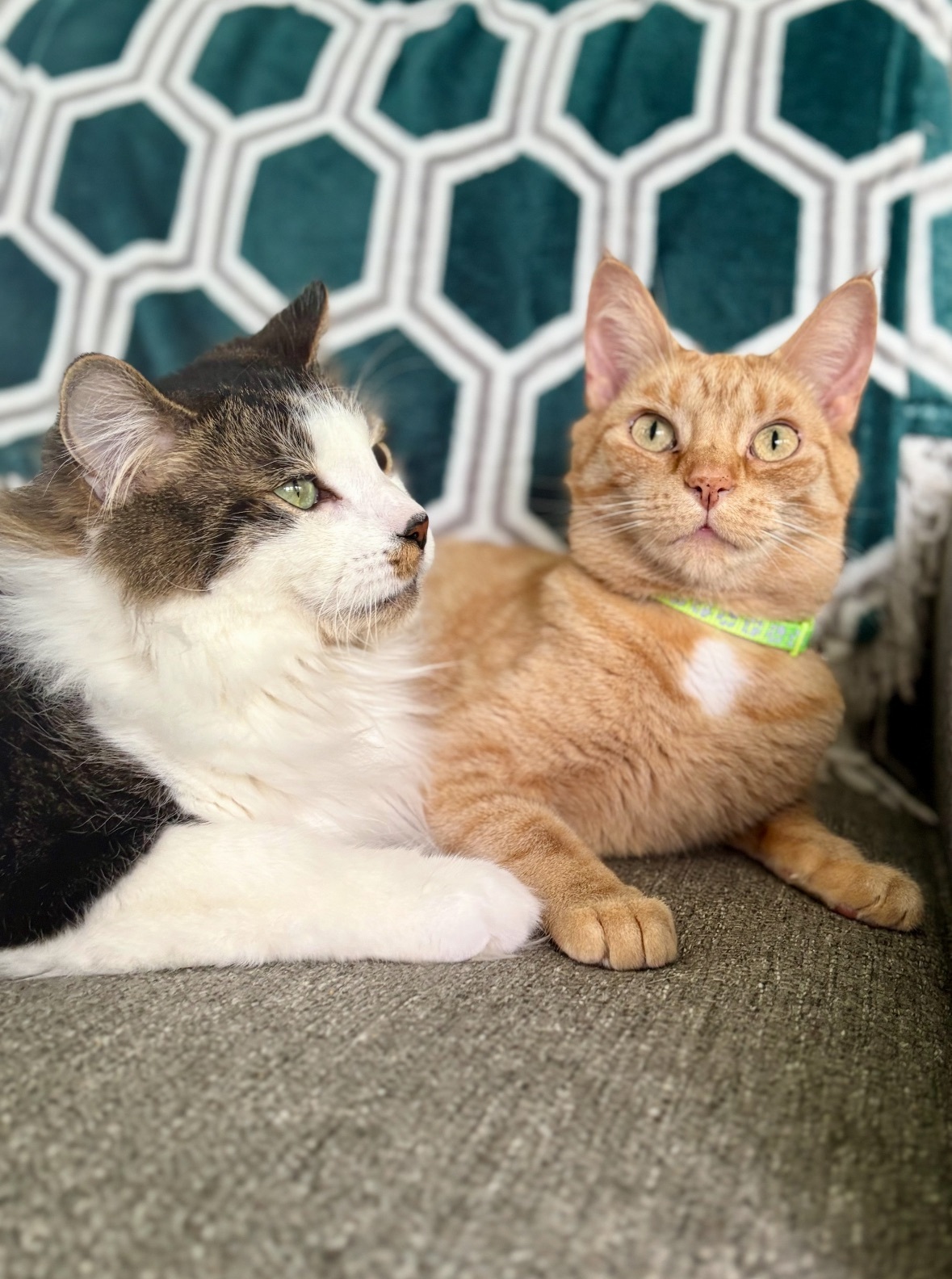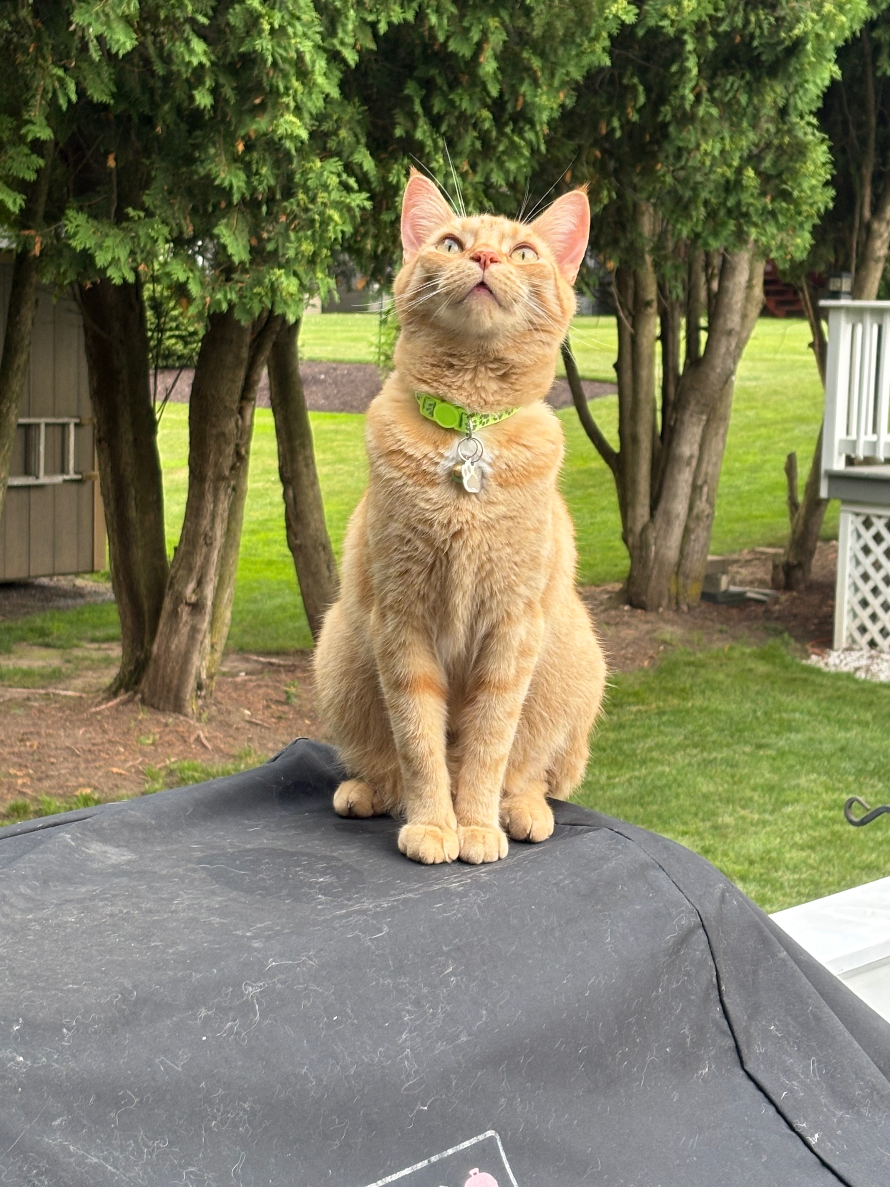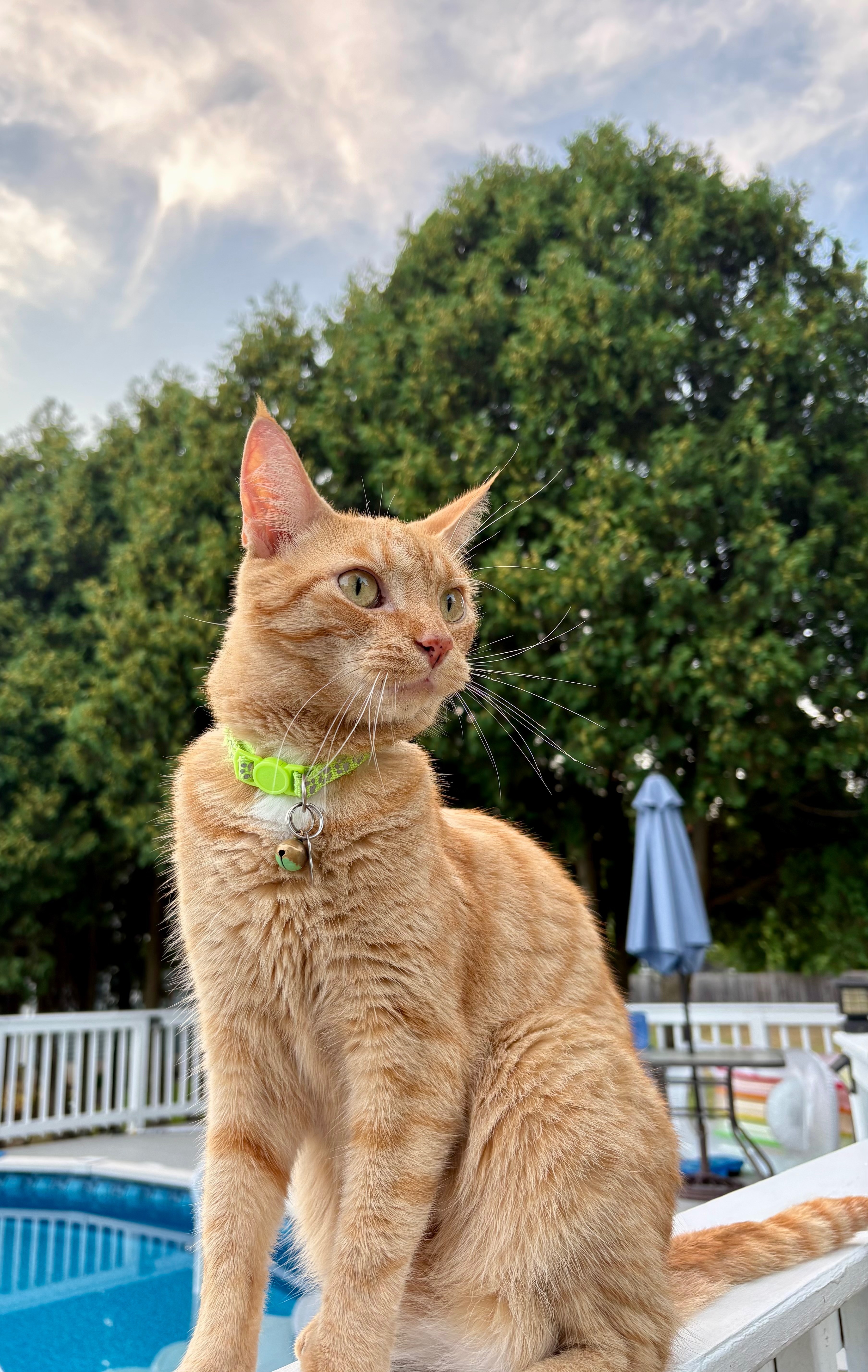 Leo is a 7 year old male neutered cat. He's an orange domestic short hair with light yellow/green eyes. He has a small white patch on his chest (under his neck) He was last seen wearing his neon green color with a bell on it. There is a name plate with our phone humber on the collar. He is very sweet (non aggressive) however he may be skittish around strangers.