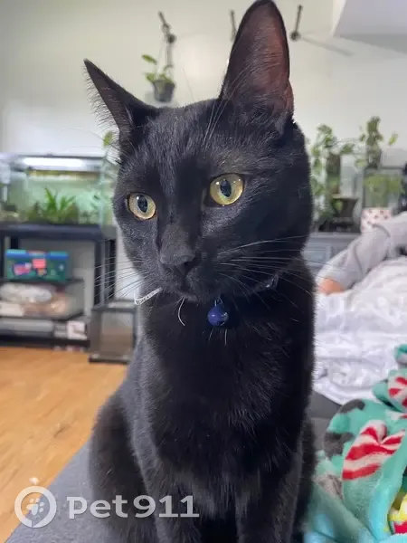 Solid black domestic short hair male cat. He is neutered and microchipped. His name is Fennel and he has a purplish collar with stars and moons on it but no tag. He’s indoor only and somehow got out
