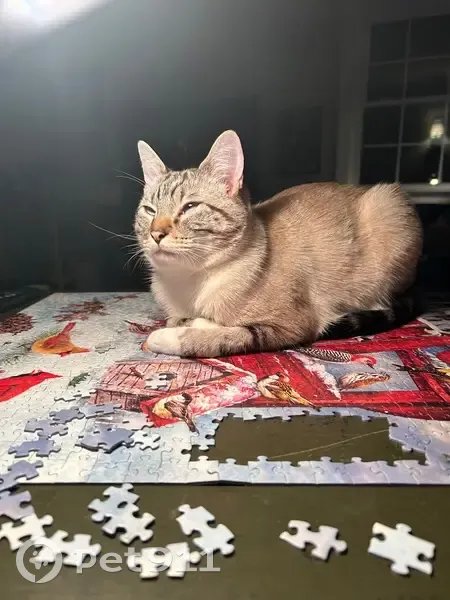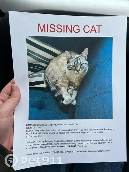 Gray/white tabby with some Siamese coloring. Black ears, black striped tail. Blue eyes. No collar. White paws. Gray striped legs. Pink nose. No collar. He ran out of the house and into the woods at dusk Thursday night and we haven’t seen him since. This is the first time he’s done this.