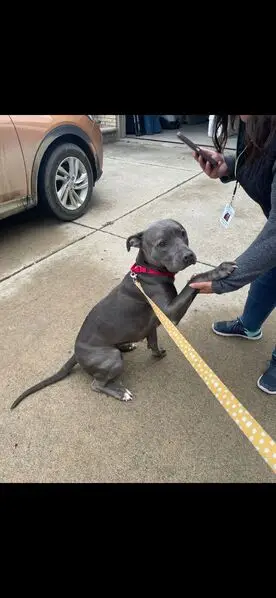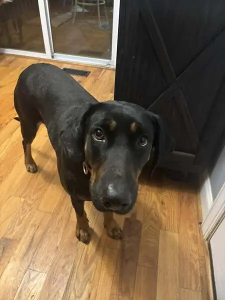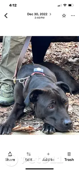 Nova is a 7 year old black lab mix and she weighs about 60 pounds. She has on a solid red invisible fence collar on. She is also very shy of people. She was in our back yard until she wasn’t.
