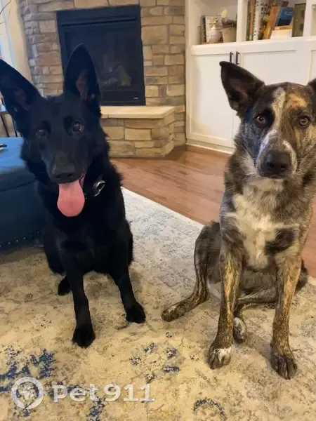 Maggie is an all-black German shepherd. She has a small while “mole” on her head. Dark brown/almost black eyes. Last seen with “Jack”, a black and tan shepherd/cattle dog mix. They took off after a deer. Her GPS collar was not fully charged and Jack’s collar had a broken clasp and fell off. Collars normally keep them on our property. Maggie is usually very friendly.