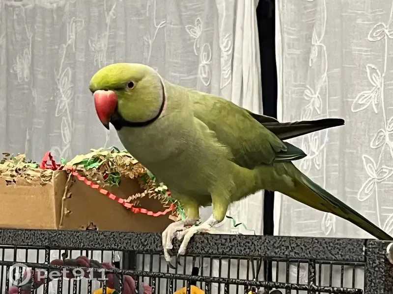 He is a beautiful green with a black ring around his neck and a very long blue tail. Jude flew out the side door that was opened by accident.