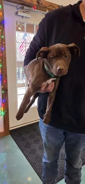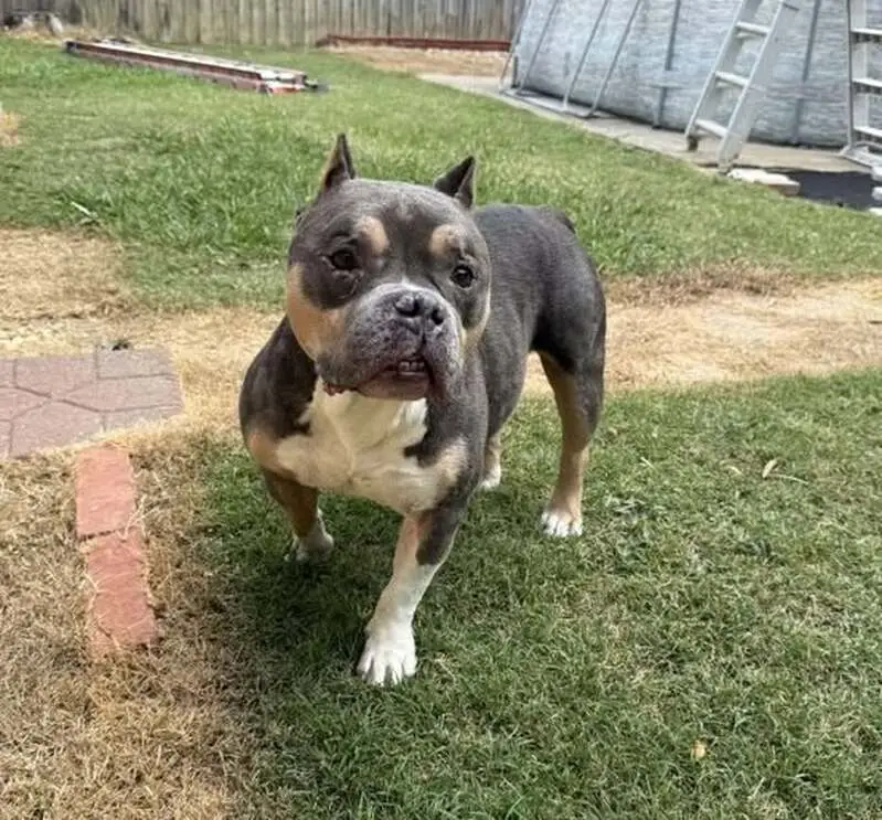 Short coat, gray fur, white chest and nose. Her teeth are nubby. She is a Staffordshire terrier. She is terrified of storms and ran away during the thunder and lightning on 9/1 around 5pm