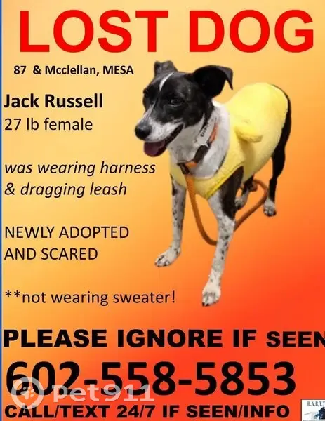 This is our new furbaby Jenna, we just adopted her on Friday from the Humane Society. She ran away while we were trying to get her in the house after a walk that night. We are desperately looking for her ️LOST newly rescued fearful dog ️ Near Country Club and McClellan Mesa AZ —-NOT WEARING YELLOW SWEATER. Wearing tan harness, pink collar and possibly dragging pink leash still—- UPDATE: She was last seen Saturday (10/4) around 8am in the parking lot of Bass Pro Shop on Dobson and the 202. DO NOT CHASE or call out. Call and text owner 24/7 and pin the location.
