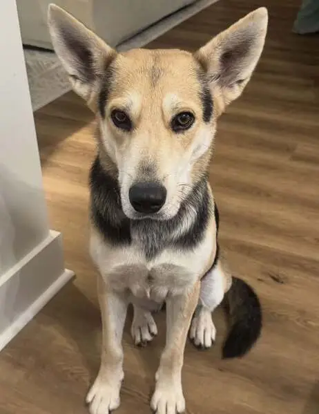 Color brown with white chest, curly tail. He tear away his collar on his escape. He is an escapist and runner please dont chase, but he comes is you call him amd pet him.