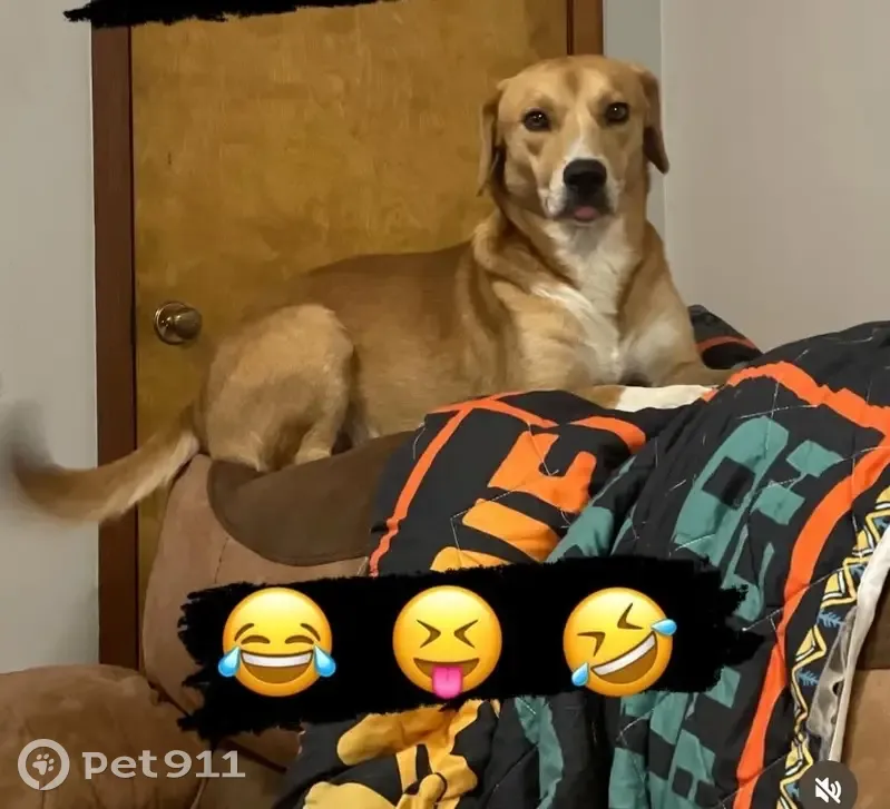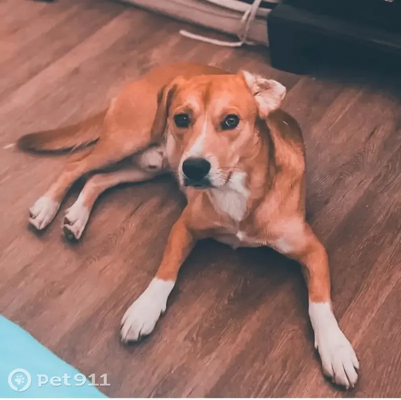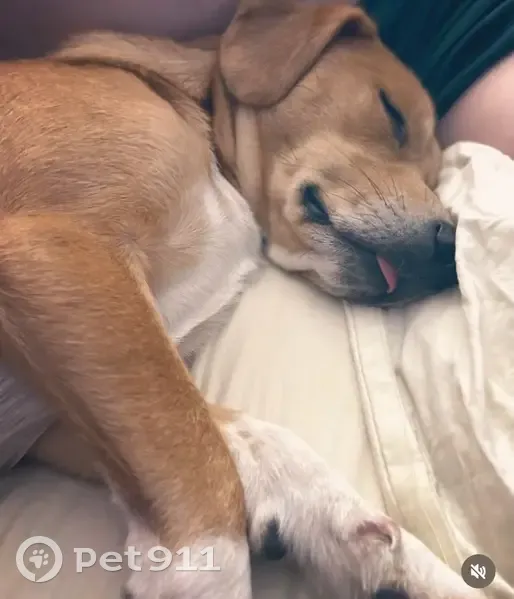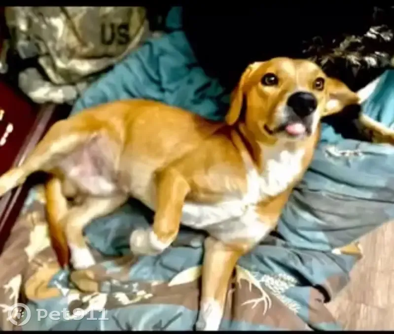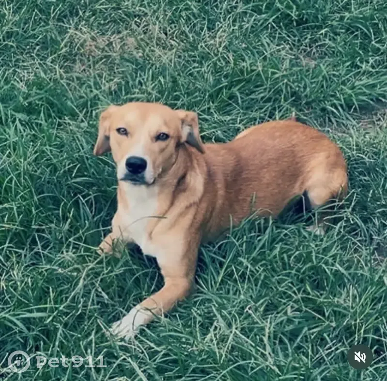 Golden Reddish coat with white chest, white paws, and white spot on the back of his neck. About 18” tall, like a Beagle. He’s a Golden Retriever/Beagle Mix. Skiddish and Timid. Answers to DocDoc and Little Boo. More afraid of men. Best to sit down and let him come to you. Little pink tongue sticks out when he’s relaxed or sleeping. Fast runner. Loves “TREATS”.