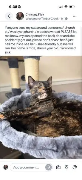 She is female that is SPAYED about 7 years old but looks very young friendly but sometimes skittish she is black and in sunlight has hung or brownish black her name is Ava