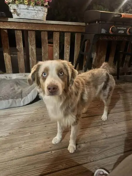 Post-pregnancy protruding nipples. Light color hazel eyes, white lower jaw, chest. Pink belly. Black tail. Skinny. Very friendly and excited. Does not bark at all!
