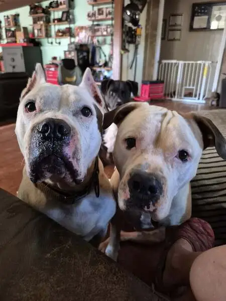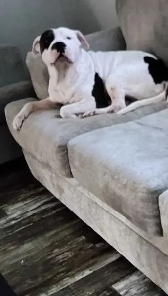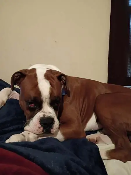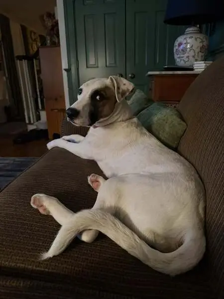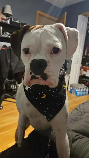 White and brown, pink and black nose, found with a collar but no chip or tags. Seems well taken care of, trimmed nails, clean coat, well fed. Very friendly with humans and my dogs and cats.