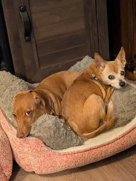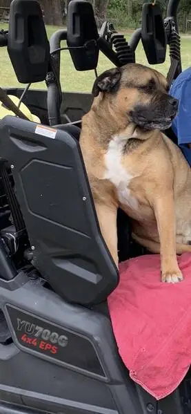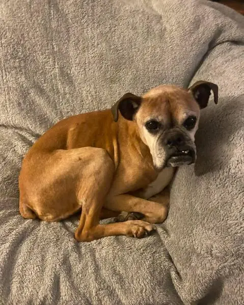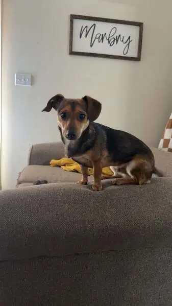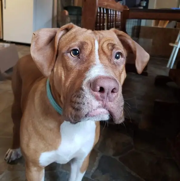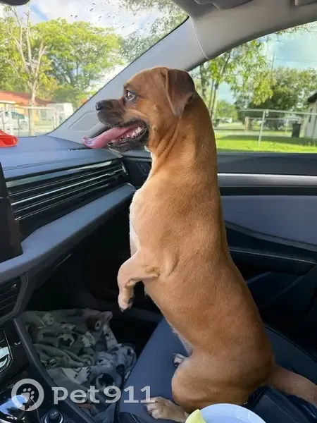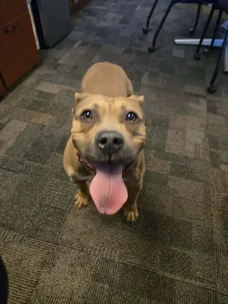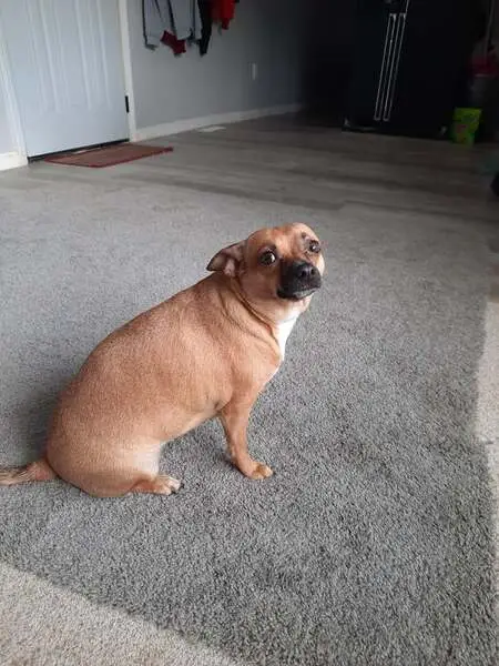 This dog looks like a small, short-haired mixed breed with a warm tan/light brown coat. It has a slightly darker muzzle and ears, giving its face a bit of contrast. The body is compact but a little stocky, with a smooth coat that looks well-kept. Its ears are medium-sized and fold down, and its eyes are round and expressive
