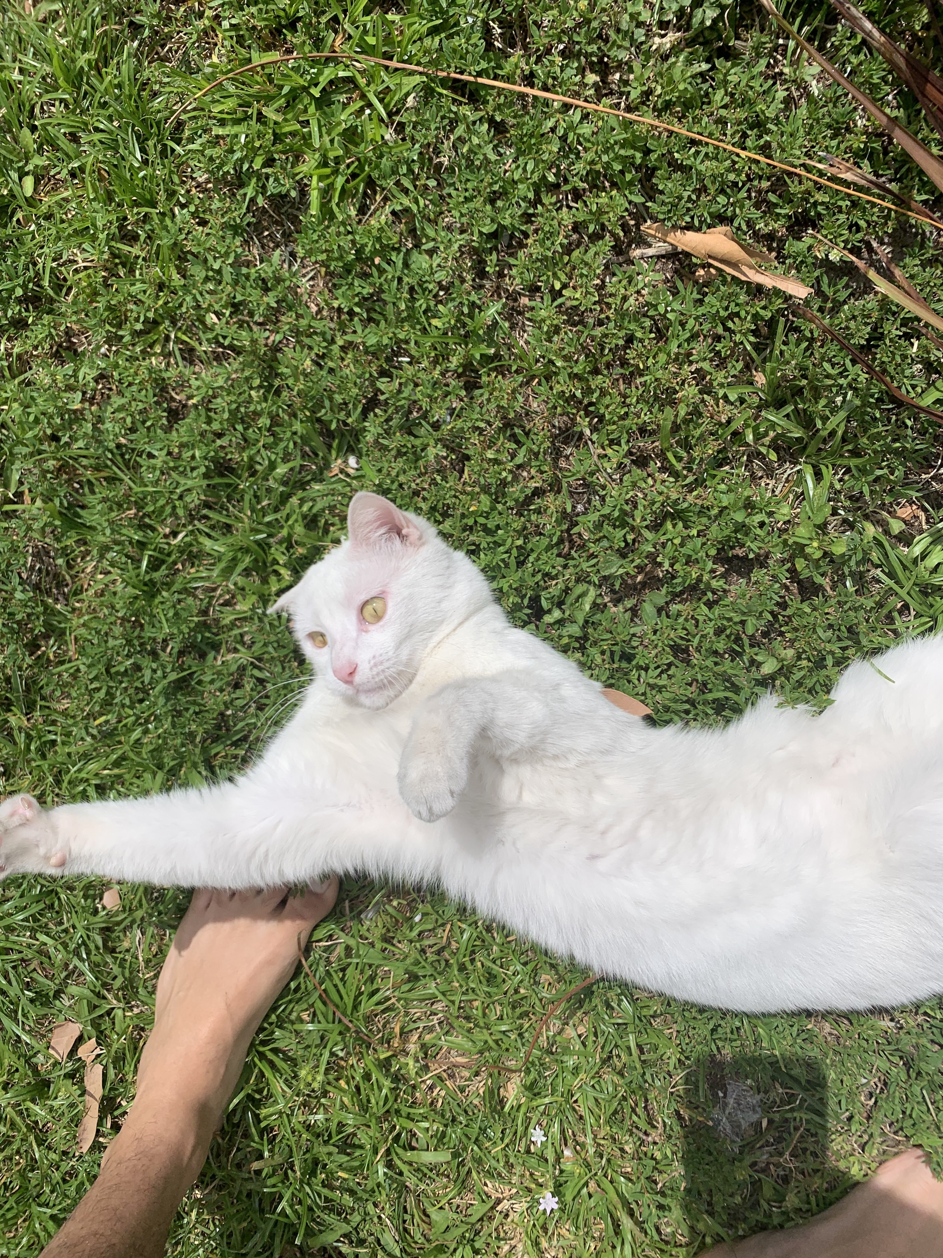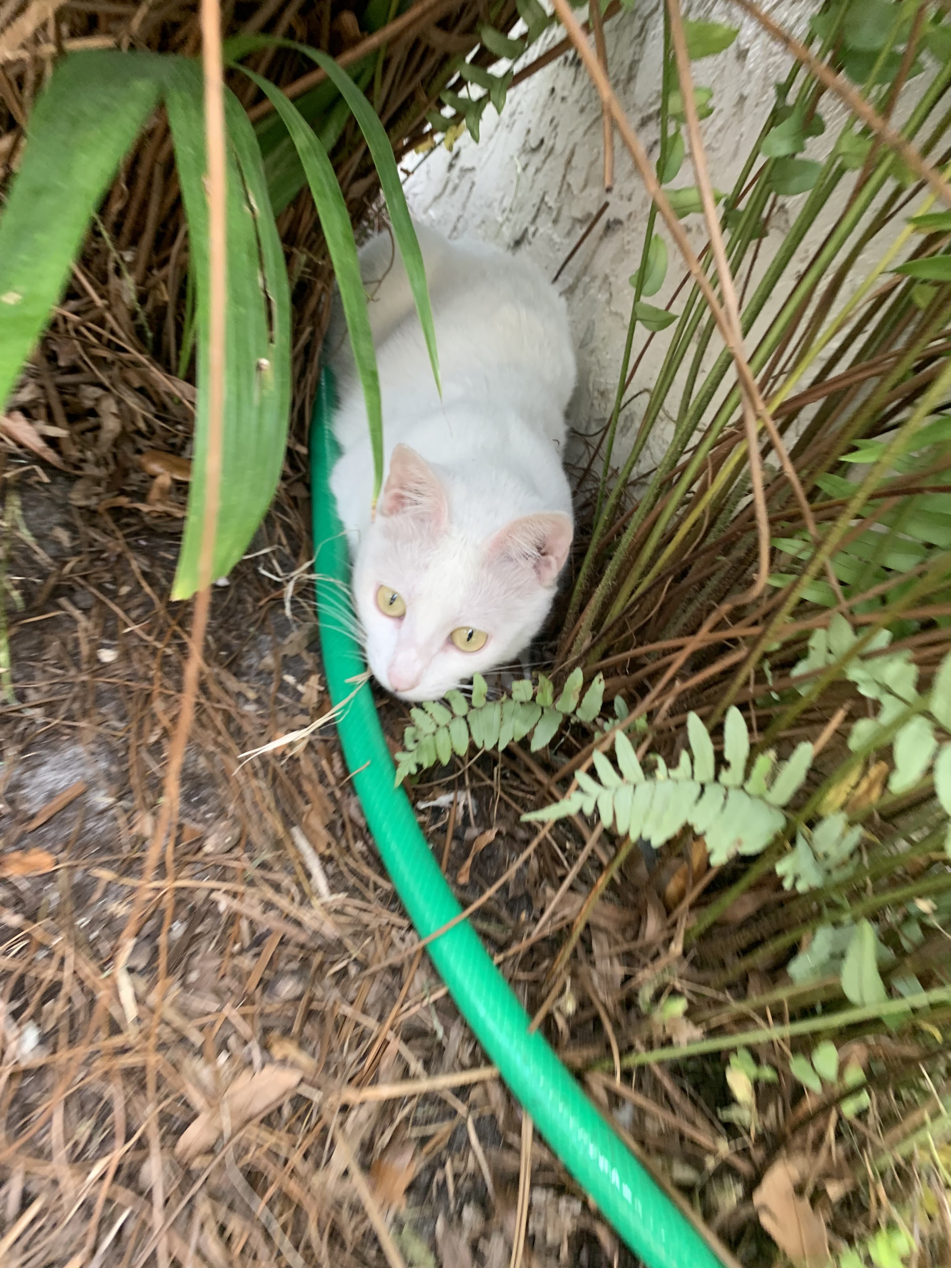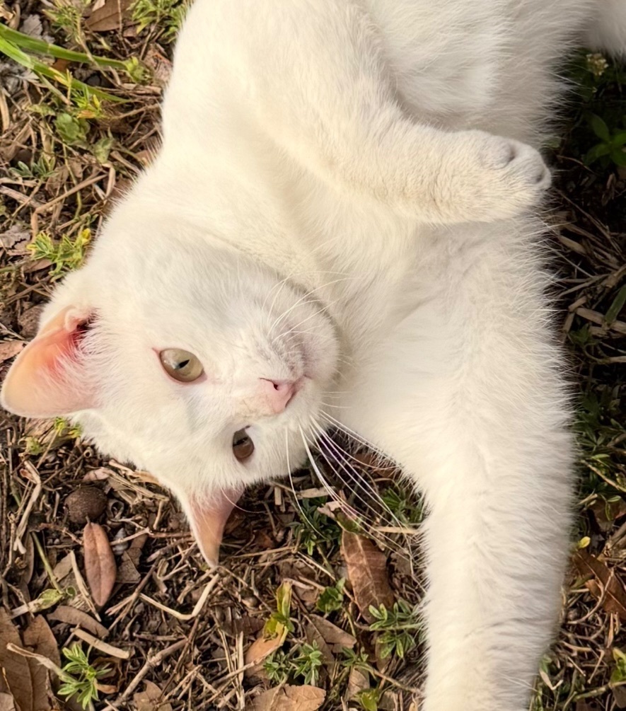 White 4-year-old cat with yellow eyes. Very affectionate and vocal with his family, but does not usually approach strangers. He may meow often and hide if he feels scared.