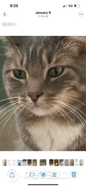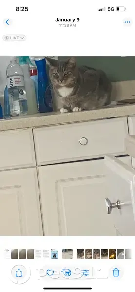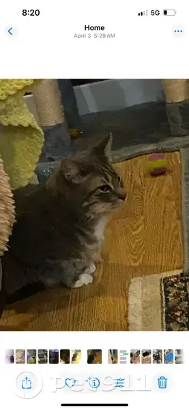 Grey swirls with white chest, smaller cat, very friendly will jump in a car go with anybody but does not like to be picked up. He’s an indoor cat and he got out the front door and he didn’t come back. There’s a reward and physically sick over it.