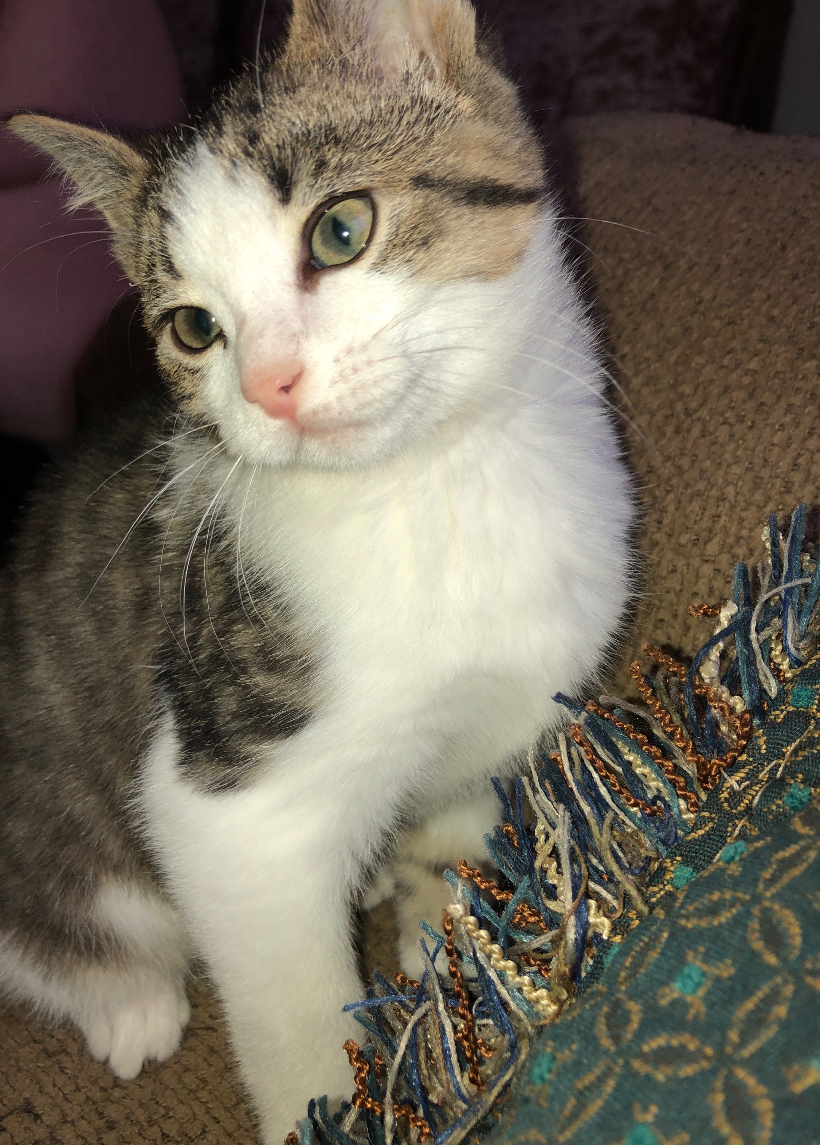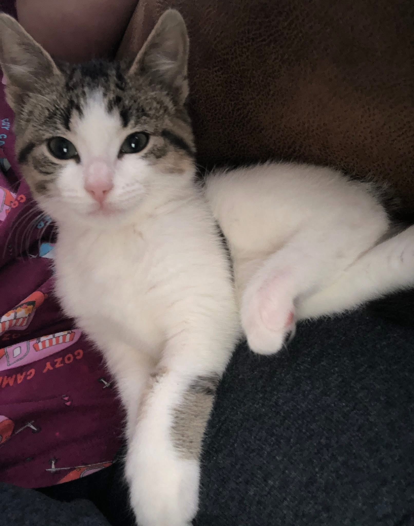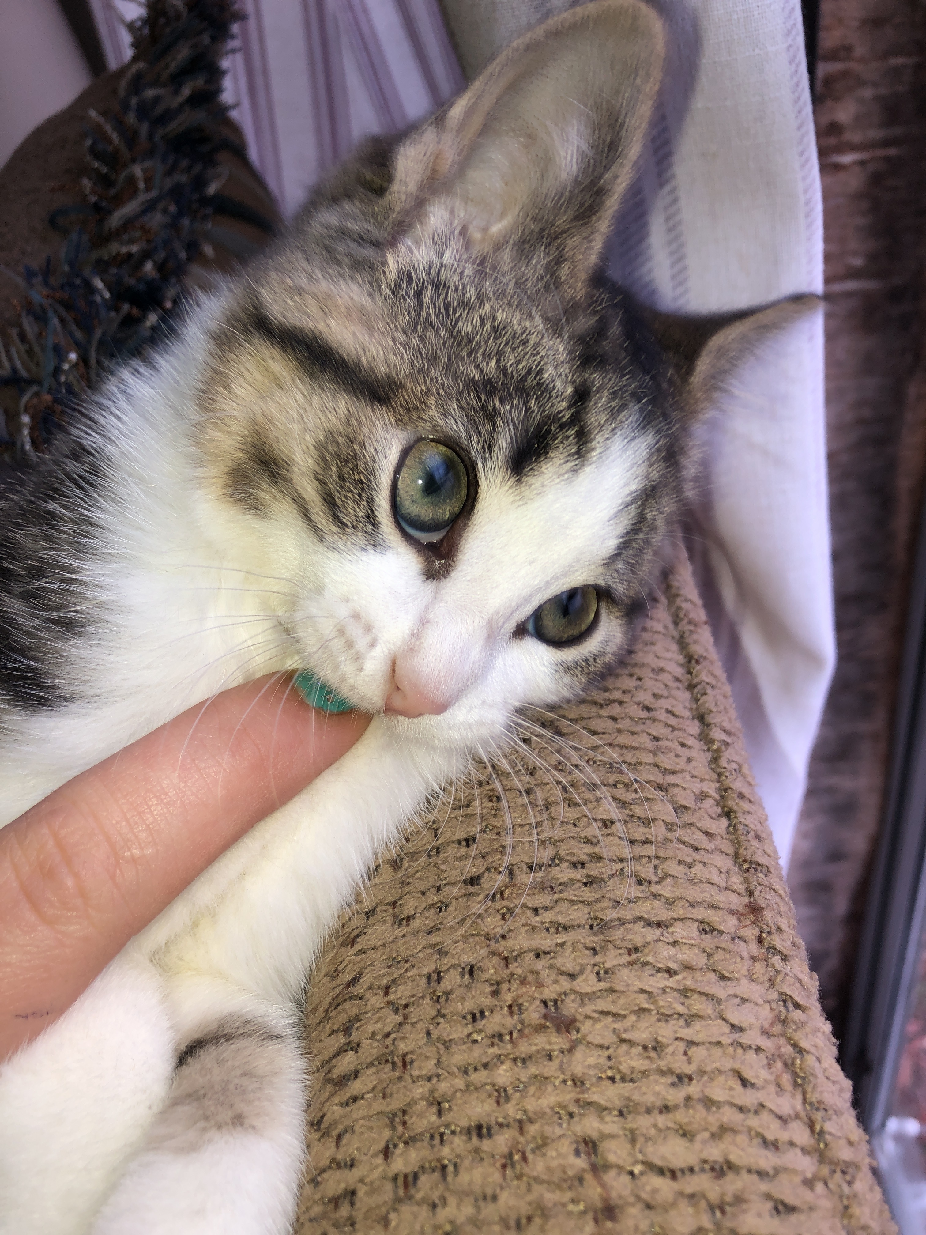 Amari is 5 months old she’s small and she is shy. She is black brown white and gray striped with a Snow White underbelly she’s got the cutest little pink nose and beautiful green hazel eyes. She is a rescue my husband and I found her in the back of our car one morning. After days of attempting to get her mother to come back we took over.. We bottle fed her we nursed her stimulated her provided her with warm and love and safety. Amari is like our child she is our child and I we just want her back.