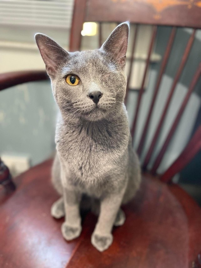 Looks like a Russian Blue - short-haired, medium grey, no markings / Missing left eye / about 11 lbs / no collar but micro-chipped. Indoor cat, not used to being outdoors.