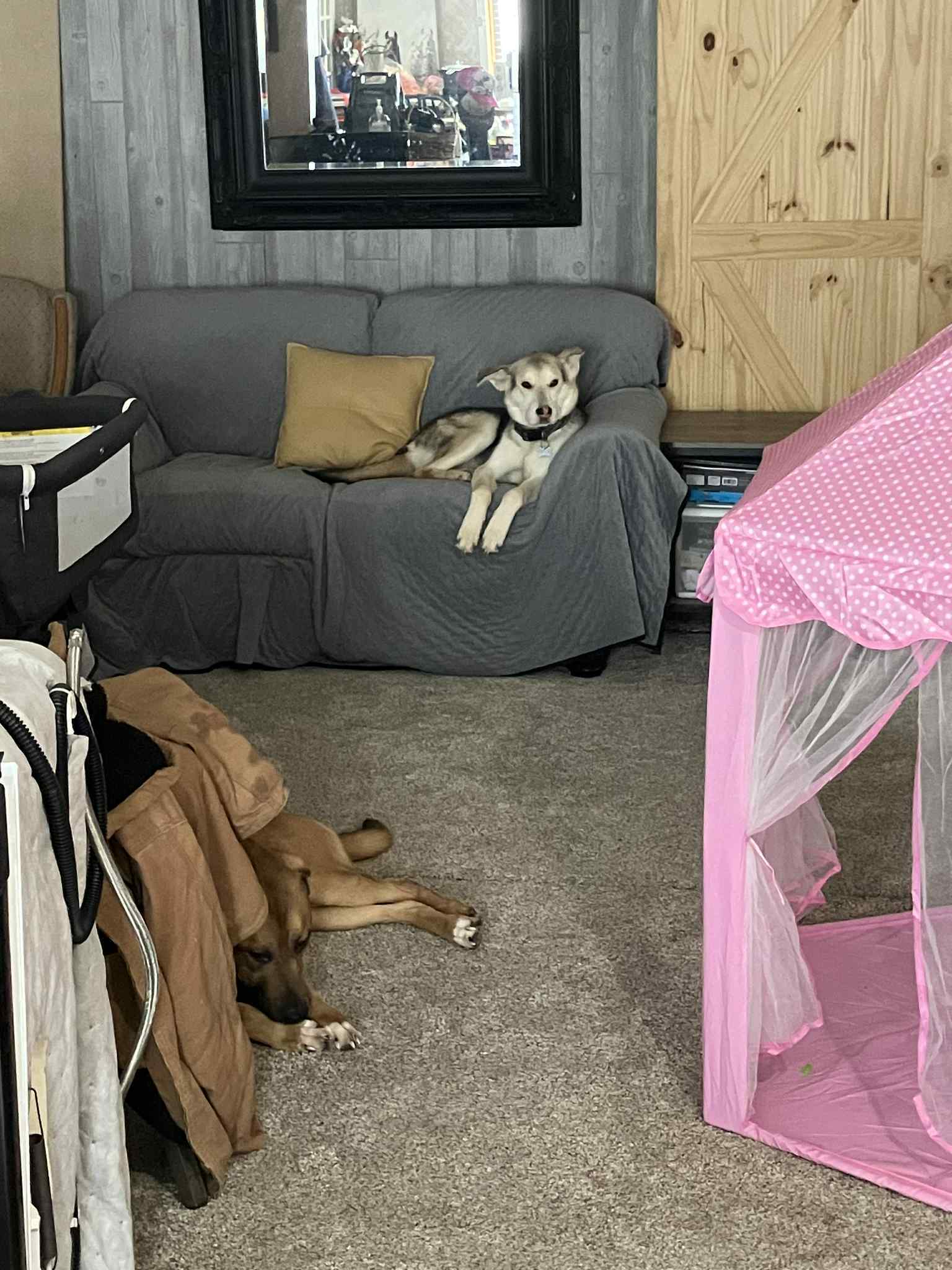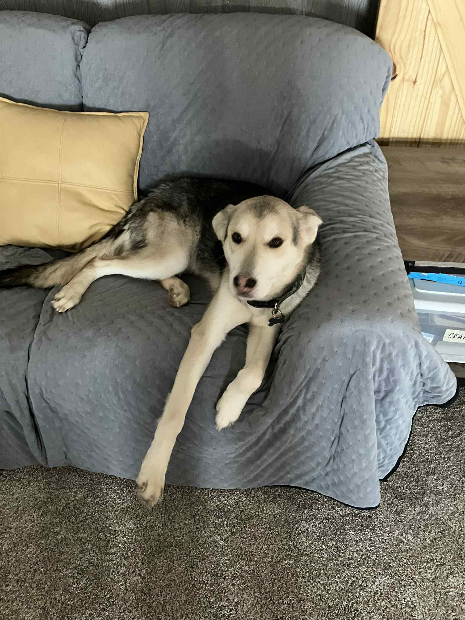 Samson is a white/cream color, and grey dog. He’s been spotted, but runs away with his tail tucked. Was last sighted running across the road from Randy’s Auto Salvage on Wolf Lake rd. He is friendly, he’s just afraid because he’s never alone and he got separated from his brothers. He recognizes the sound of food shaking in a metal bowl, if that helps.