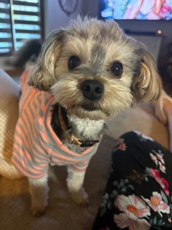 Greyish/tanish/whitish coloring, but fur is black on his back. He is two, is wearing a sweater. He jumped out of the car at Elizabeth Park, near Jefferson, when he was about to go on a walk. He is very small (7-10 lbs), very skittish, and is being treated for seizures.