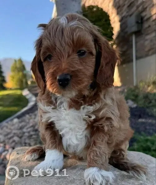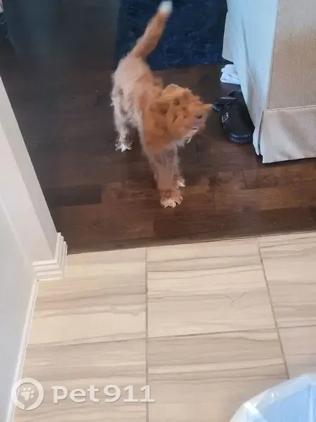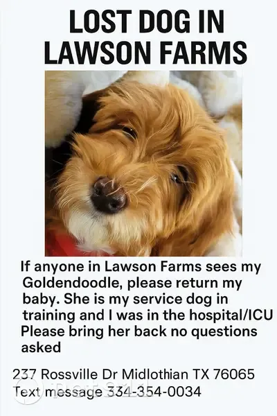 Reddish brown, with white paws. And white chest. Mini goldendoodle She is my service dog. Just had a fresh hair cut before I was put in ICU. Please return her. She is my medical ️ alert service dog.
