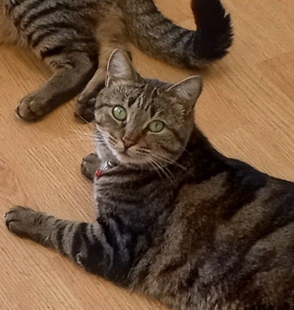 LAST SEEN IN PARKING LOT OF OFFICE PARK OFF WEBB RD DOWN FROM THE TARGET CENTER ON HWY 9. Very friendly and sweet grey tabby with VERY BRIGHT KIWI-GREEN EYES! She often walks up to strangers to say Hi. Is wearing a pink floral collar with a bell and charm on it.