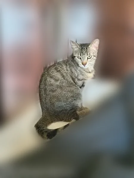 Brown small tabby with 3 black circles on her tail