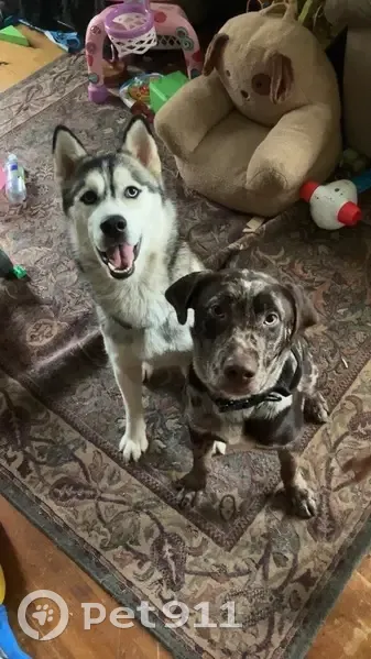 The husky is great and white and Orion is brown and white. Atka is a happy boy and excited. Orion is pretty calm and can be shy. The door was left open and they both ran out