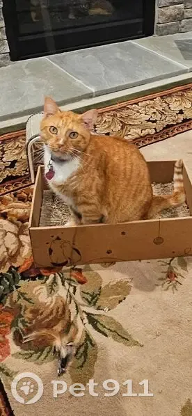 Male, fixed, orange and white cat. Was wearing a purple collar with pink heart tag. Got outside and may have been taken and could be in any surrounding area.
