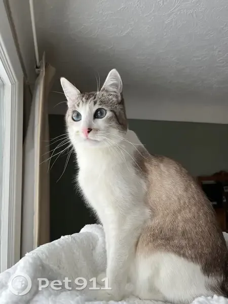 White/Beige coat, black/white striped tail, pink nose, blue eyes. Snuck out at 10pm when we took the dirty litter out. He is friendly but a scardy cat. Strictly indoor.