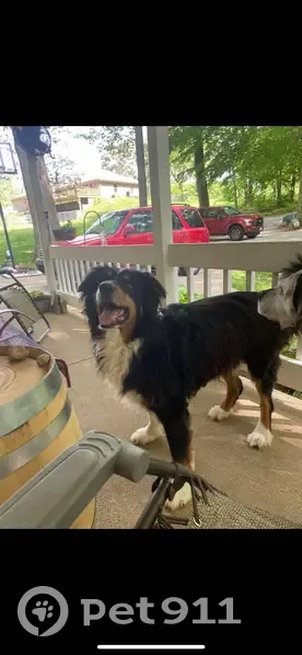 Try-colored collie/shepard primary black with white chest and paws and brown accents Was last Seen with a American bandana on no collar