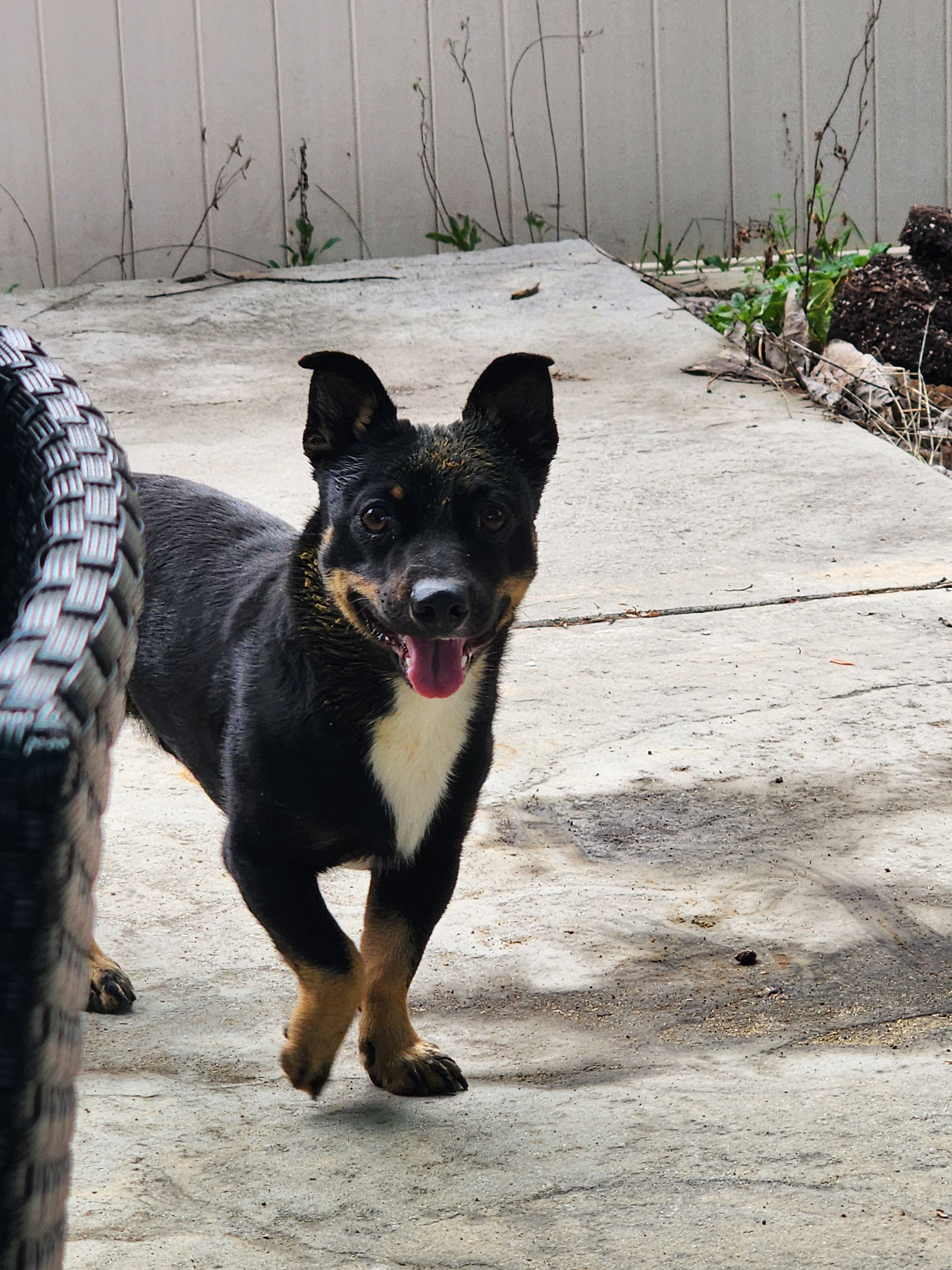 Medium sized black dog <25lb male, unneutered. White chest, tan paws and eye brows. Very skittish, but very very sweet and loving.