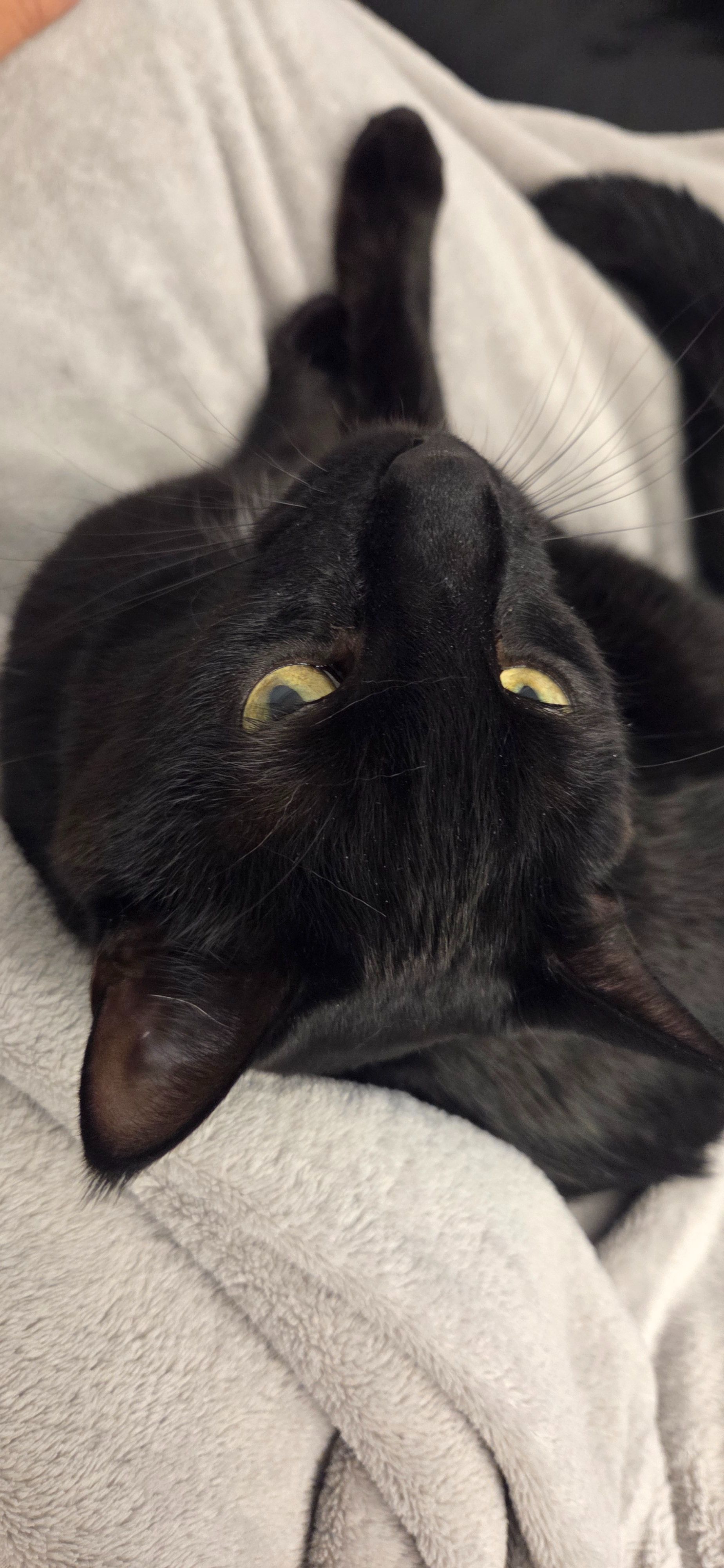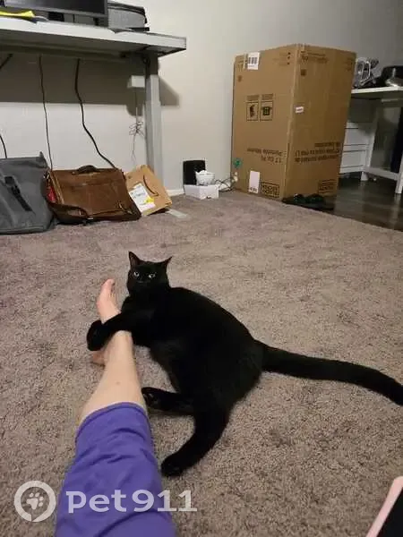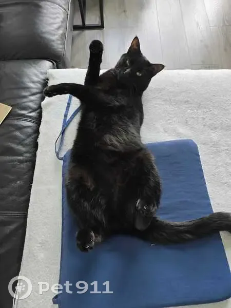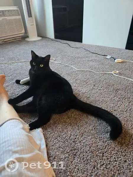 A black cat with a little bit white fur at the chest. Long nostril, 2 ft long body with 1 ft long tail. Brave and will respond to calling his name Loki
