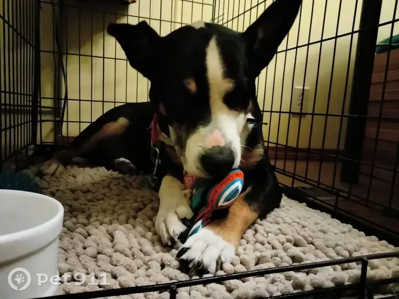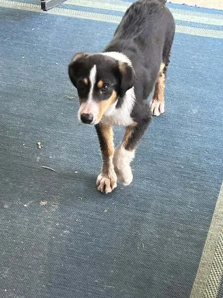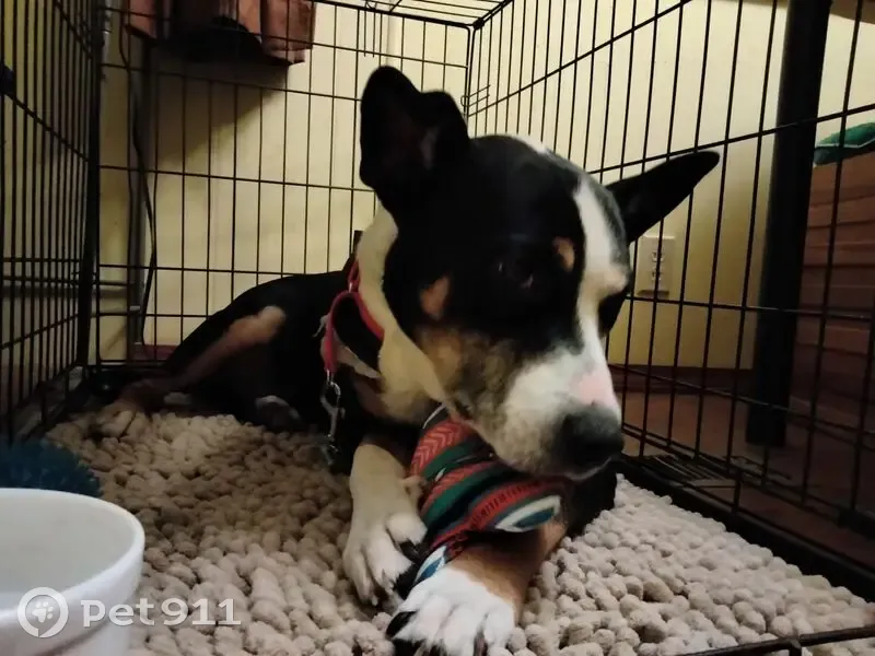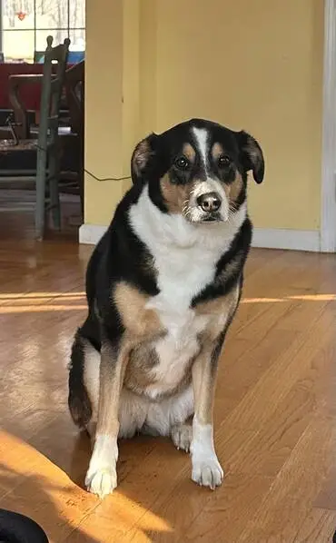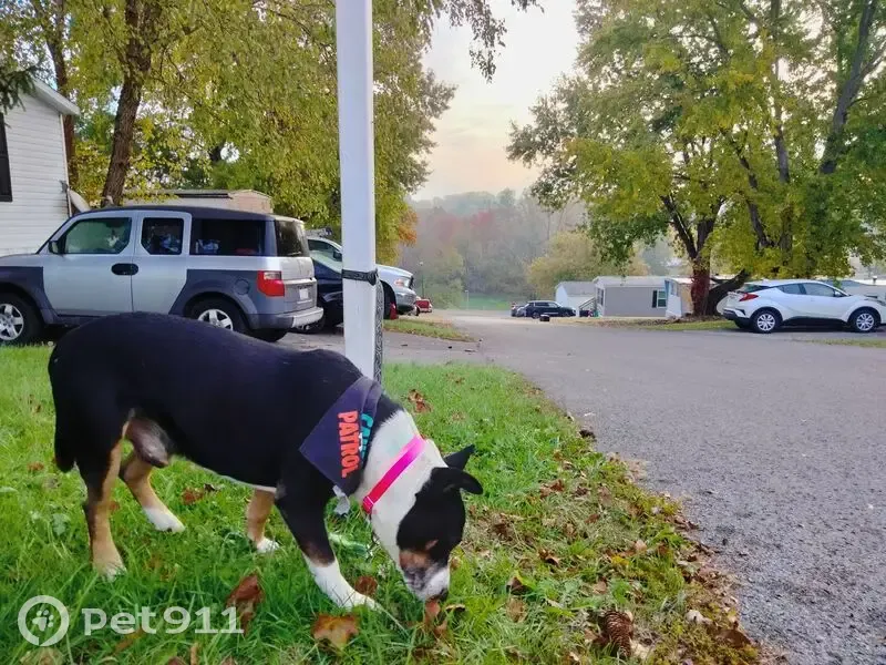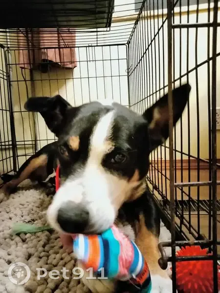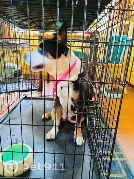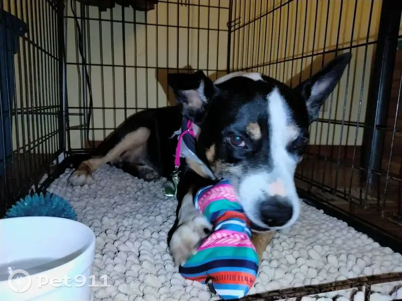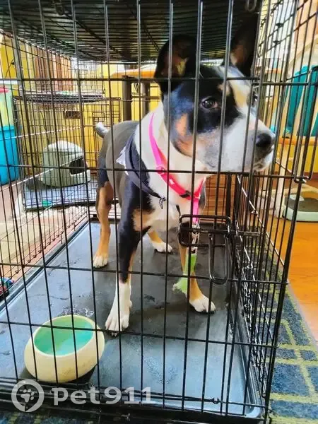 Unaltered Male 55 lbs tri color, pointed up ears, one being sort of crinkled on the inside edge, making that ear tip over. Found with a neon green severed leash hanging from a neon pink slip collar and a black bandana. I walked right up to him and took him by leash.