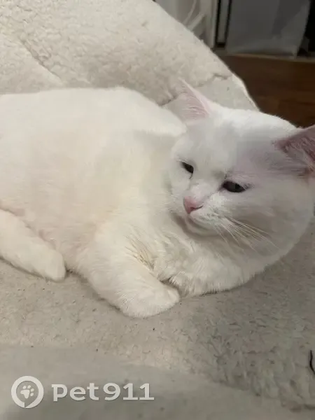 All white, very friendly. Likes to rub against legs and ask for pets. She can be very vocal. Only likes poultry foods like turkey and chicken. She is a stubbier cat so she’s shorter