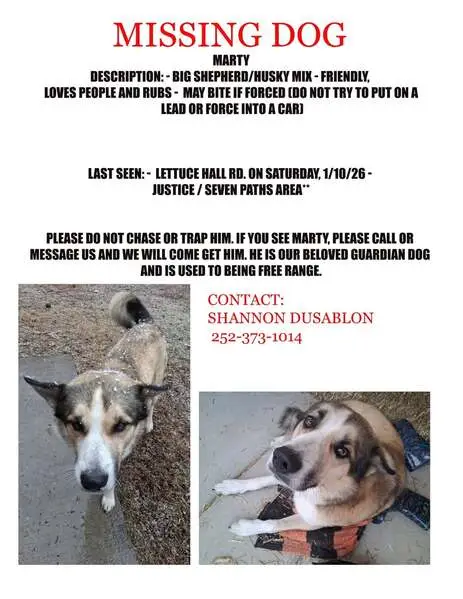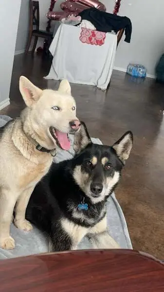 This Husky showed up at our ranch with another dog. He is a nice dog has manners he's white and black and cream colored. Blue eyes. Around 5 or 6.