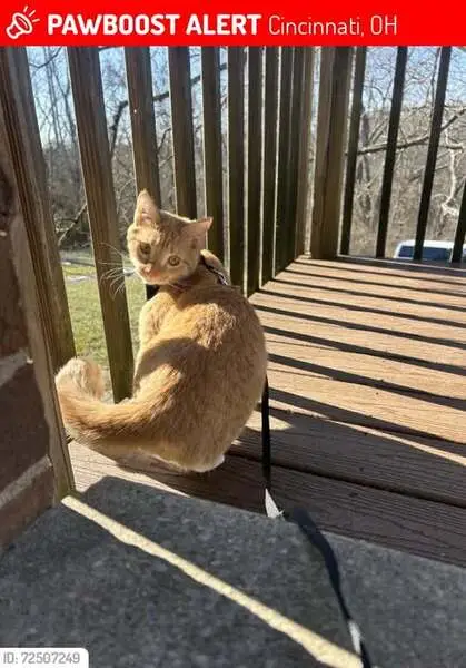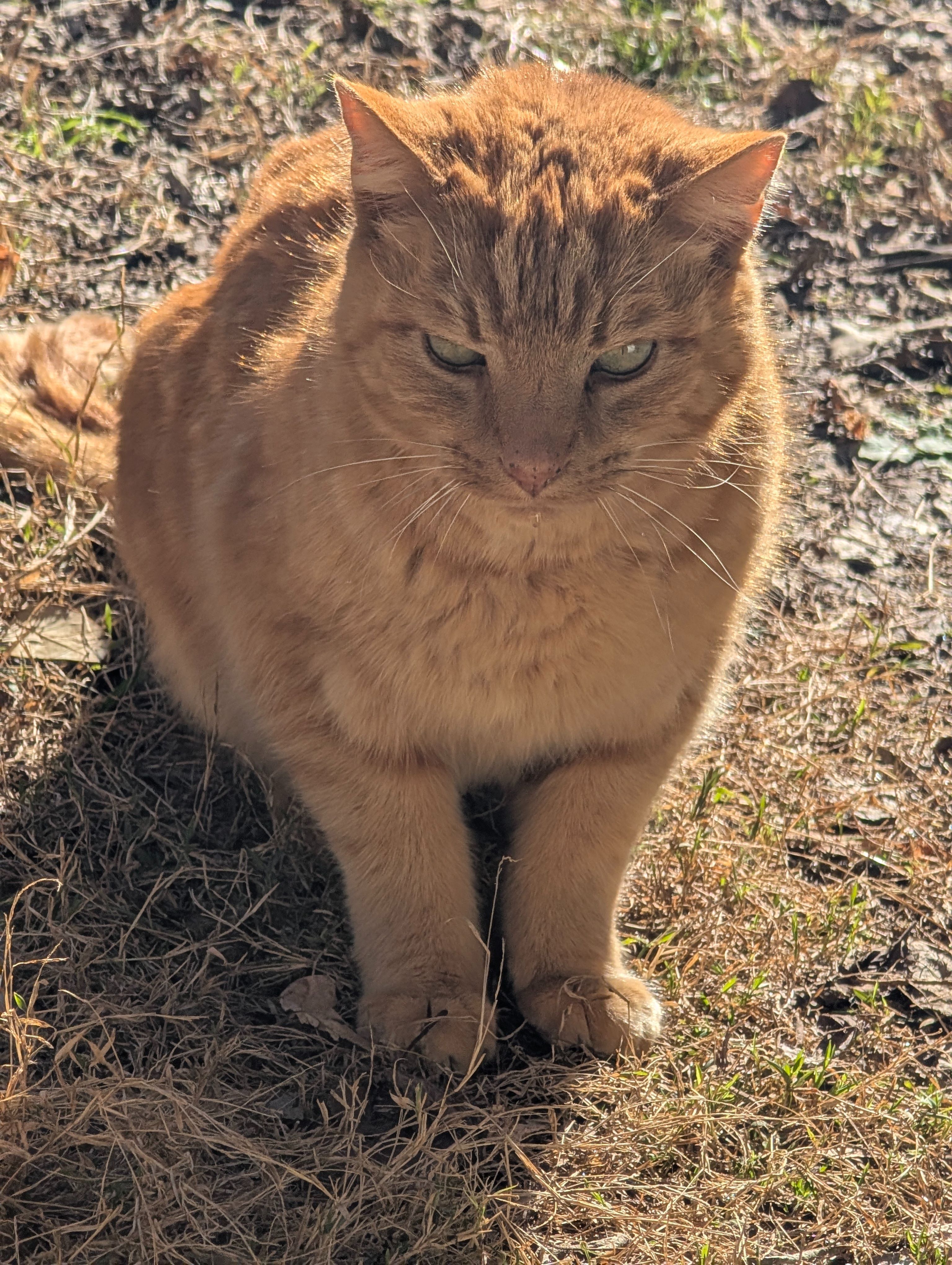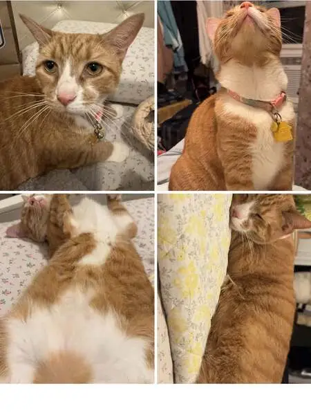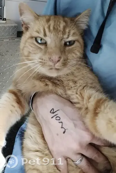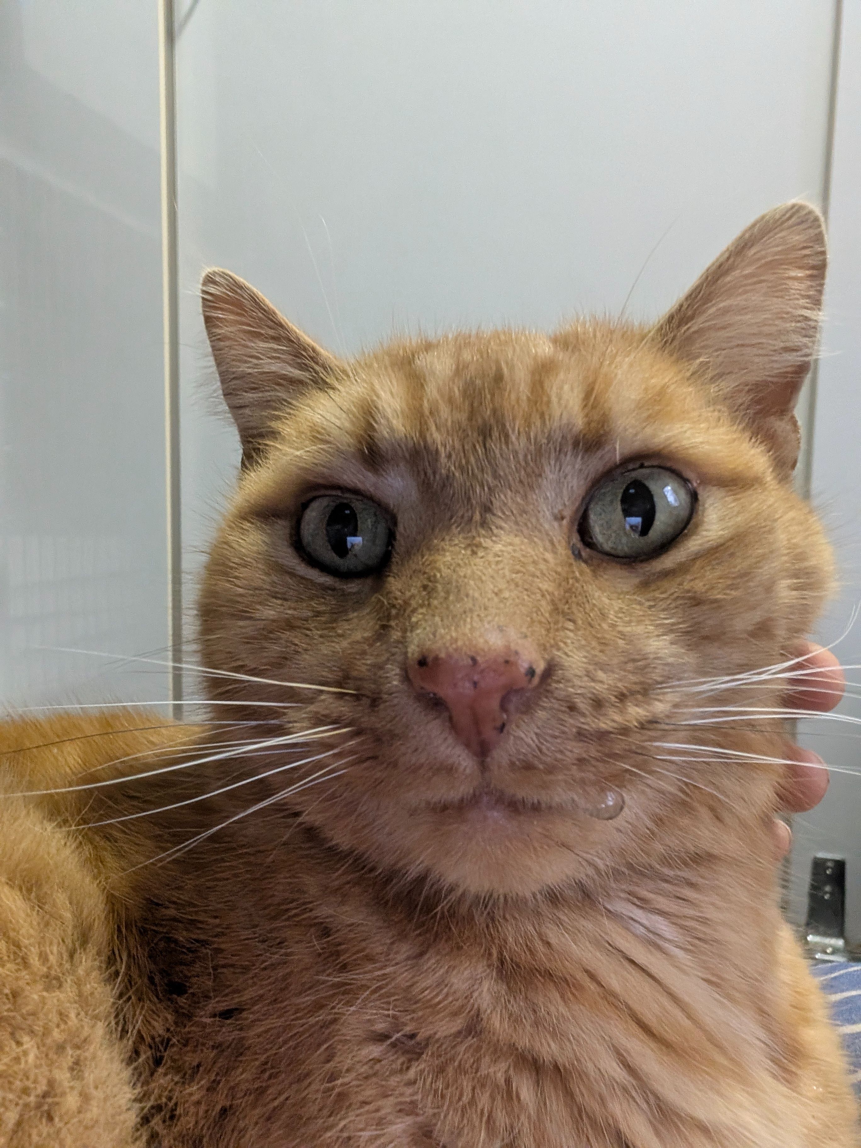 Orange male/neutered cat. No microchip. Very friendly. Talkative. Purrs so hard that he drools. Litter box trained. Freckles on nose and left eyelid