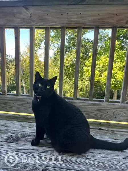 Salem is an all black cat and he has an orange Halloween themed collar with a bell. He was at my house and ran out the door around 3am on November 1st, and has not been seen since.