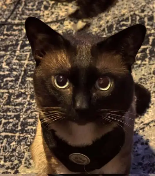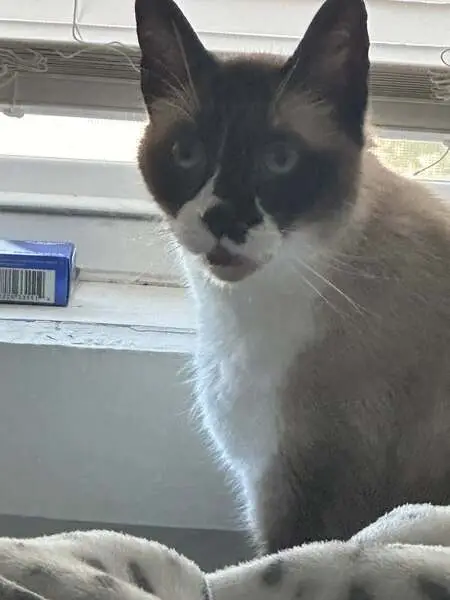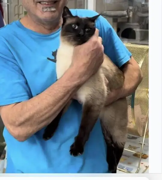 Siamese cat, blue eyes, ate half a Sheba tub that we tossed to it, and then trotted away before we could get closer than about 20 feet. Last seen crossing Orchard St.