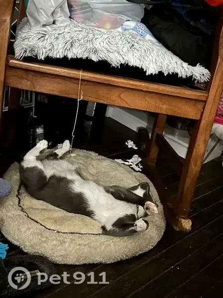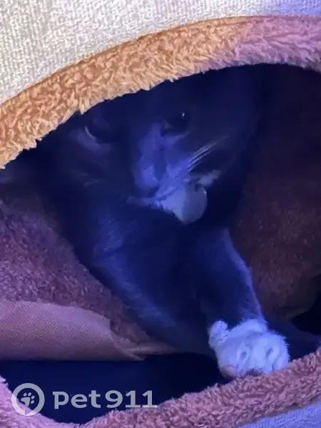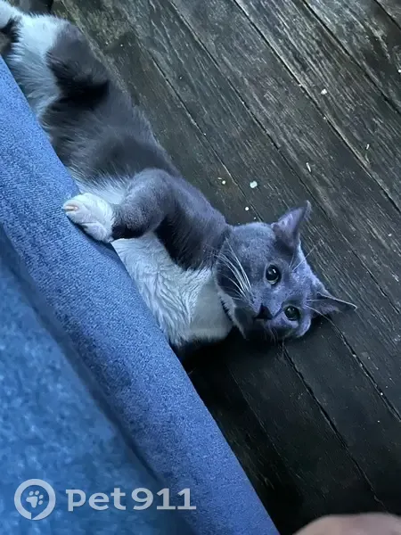 He is friendly, is grey, and on the bottom is white, his name is Mr: Bean. My husband is totally blind and he went to the door that was open to go smoke outside and beans run outside. He has the most beautiful eyes he is my baby please help me my heart hurts so much.