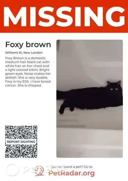 Black medium hair female with white hairs on her chest. No collar but chipped. Fur is soft as silk. Big bushy tail. Foxy Brown is my ESA. I have breast cancer. Other places she may have escaped are Regency Inn and Suites on Frontage New London and Waterford Walmart.