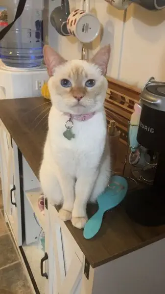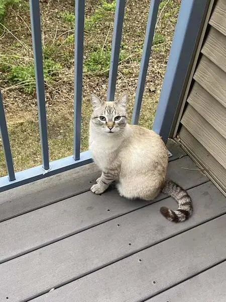 Young cream-colored male cat with soft beige fur, light lynx-tabby face markings, and bright, alert eyes. He has a gentle, calm expression, a slender build, and a friendly, relaxed demeanor. No injuries and no chip