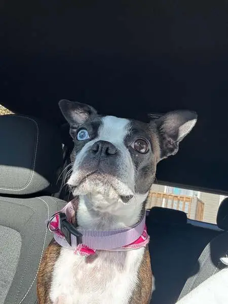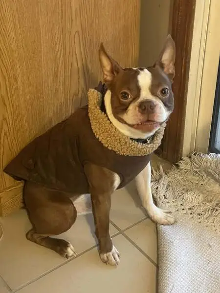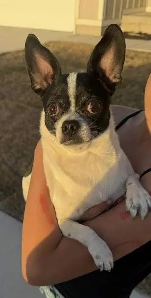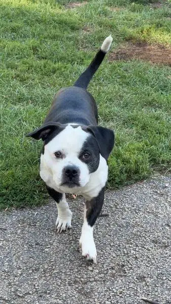 Very friendly male. He ran right up to us, he has a bandanna on and a collar with no tags but a leash that’s a bit roughed up.